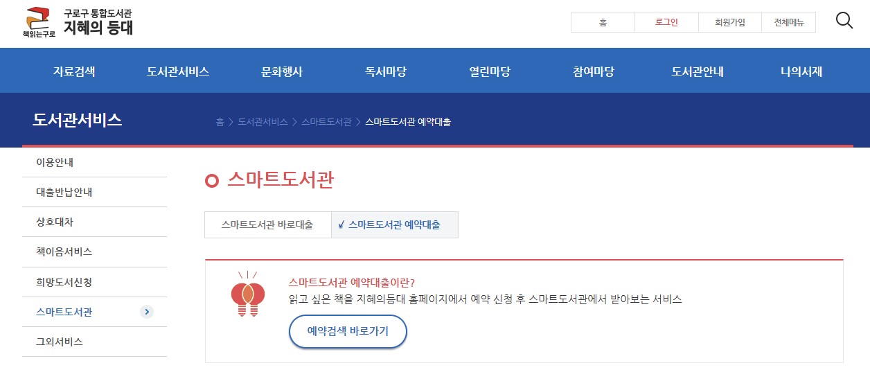 도서관 서비스 → 스마트 도서관 → 스마트도서관 예약 대출 탭 클릭 → 예약 검색 바로가기
