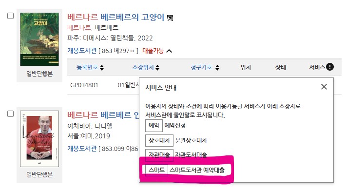 스마트 도서관으로 예약 대출 신청 후 도서를 대여하는 방법도 있습니다.