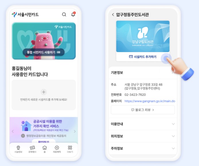 (ex) 구로구 통합 도서관 회원 가입 후, 구로구 통합도서관 시설 카드 추가